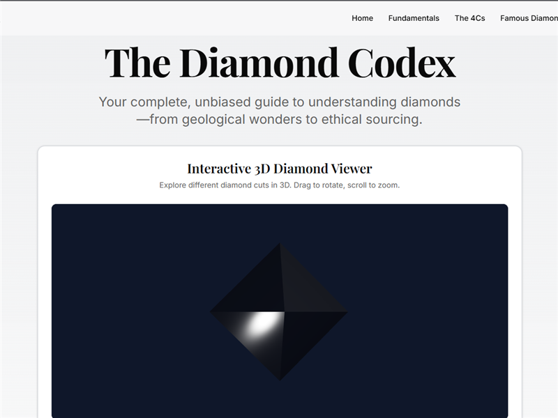 An educational platform about diamonds, featuring interactive 3D models and extensive knowledge base highlighting natural vs. lab-grown diamonds.